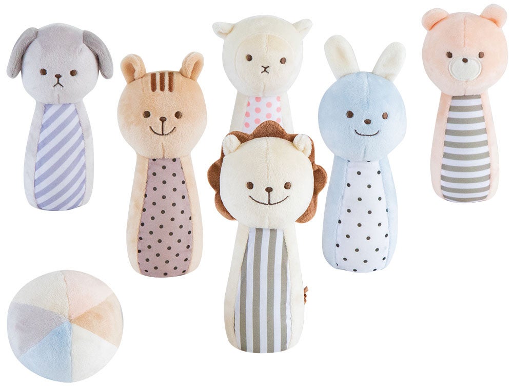 表情豊かなかわいい動物たちのボウリングセット。ボールを転がして動物のピンを倒すと、中の鈴が優しく鳴ります。ふわふわと優しい素材と柔らかな色あいの布製のおもちゃなので、ご出産祝いやファーストトイにぴったりです。