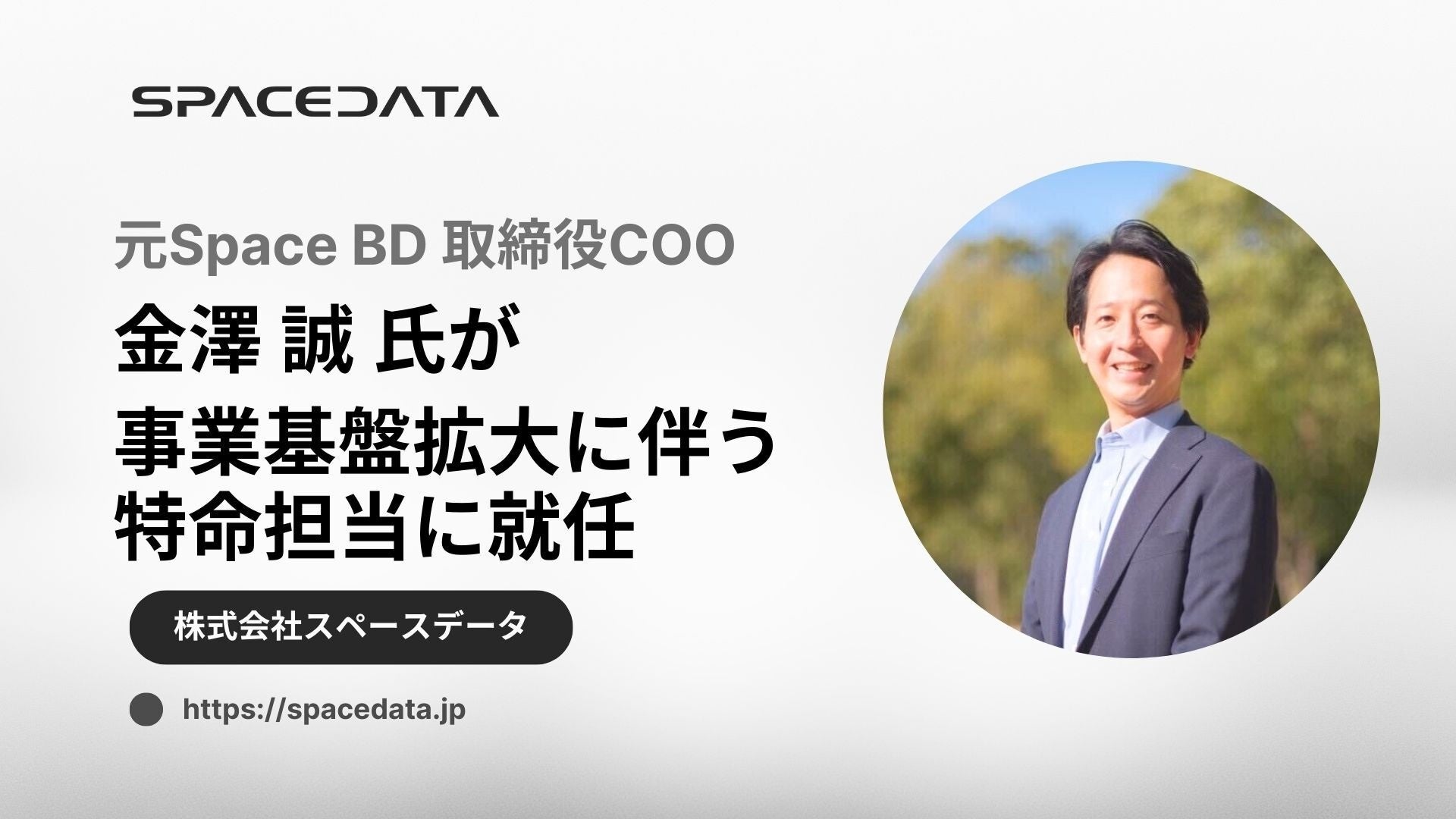 株式会社スペースデータ(本社:東京都港区、代表取締役社長:佐藤航陽、以下スペースデータ)は、2025年4月より、元Space BD株式会社 取締役COOの金澤誠氏が事業基盤拡大に伴う特命担当に就任したことをお知らせいたします。