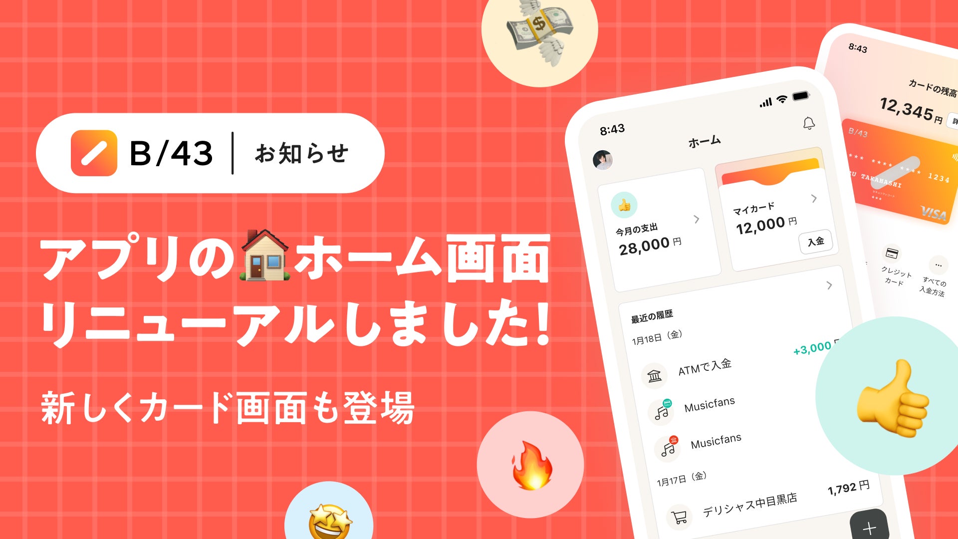 ホーム画面で今月の支出額やカード残高、最近の履歴が把握できます。B/43 カードへの入金ボタンも登場しました。