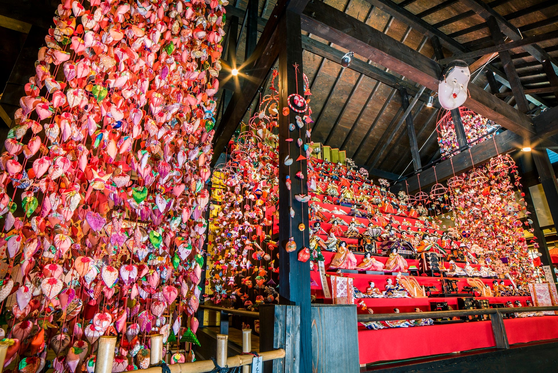 1617年創立とされる素盞鳴(すさのお)神社。稲取と海を皆見守るお雛様として、神社の118段に雛人形とつるし飾りを展示しています。屋外では日本一となる118段のひな壇飾りが展示されます。本殿に向かって伸びる石段に約500体のひな人形が並び、両脇は色鮮やかな伝統のつるし飾りで彩られます。急階段に壮観な光景が広がり、訪れる人の目を楽しませてくれます。期間中、近くを走る伊豆急行線の一部列車が徐行運転し、車窓から眺めることもできます。「雛のつるし飾りまつり」の関連行事。2024年は例年に比べ約2倍のつるし飾りが展示されることになりました。