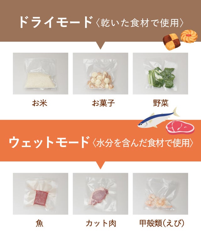 1.ドライモード・ウェットモードで幅広い食材を真空保存
