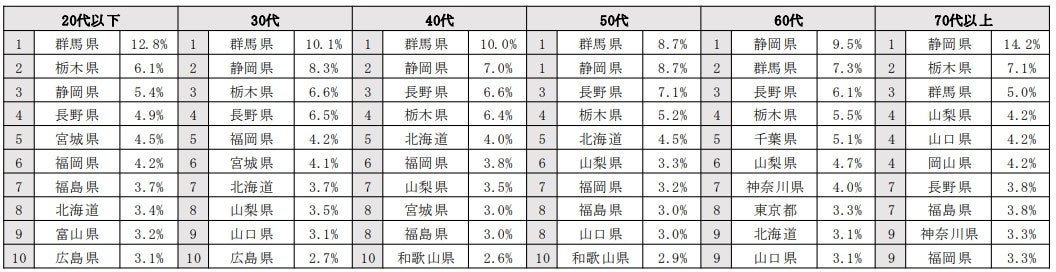 1位:群馬県、 2位:静岡県、 3位:栃木県