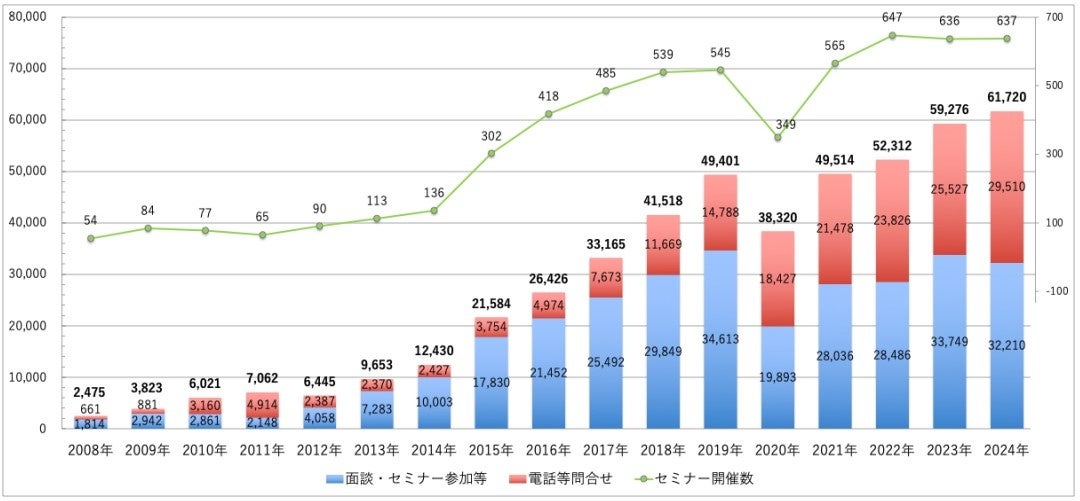 2024年の移住相談件数(面談・電話・メール・見学・セミナー参加)は、61,720件だった。2023年(59,276件)に対し4.1%増となり、4年続けて過去最高となった。また、移住相談会・セミナー等の開催数は637回で、セミナーの開催方法は、オンラインが251回(39%)、対面が247回(39%)、ミックス(オンライン+対面)が139回(22%)だった。