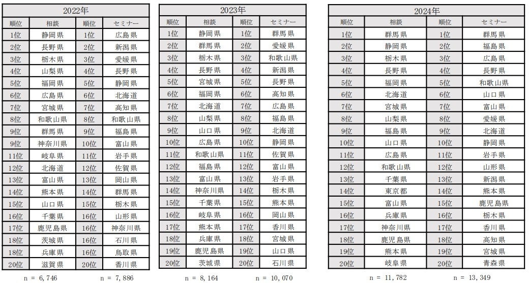 窓口相談では、初めて群馬県が1位となった。また、ランクアップしたのは、9位の福島県(前回12位)、13位の千葉県(前回15位)、16位の兵庫県(前回18位)。前回ランク外だった東京都が14位になった。