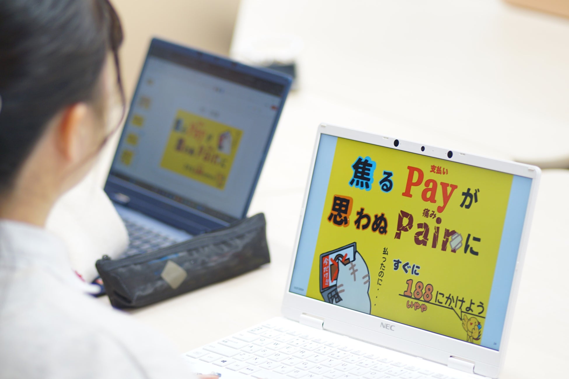 ショッピング詐欺をはじめとした悪徳商法は「残りわずか」「期間限定」などの言葉を操り、消費者に特別感や切迫感を与えることで正常な判断がしにくくなるような手口を使います。そこで、心理学を学ぶ学生が「焦るPay(支払い)が思わぬPain(痛み)に」というフレーズを考案し、記憶や印象に残りやすい色味を使ってデザインしたステッカーを制作することで消費者被害防止を啓発する取り組みを行いました。