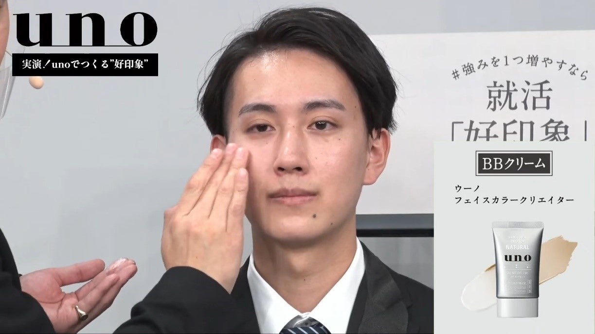 ヘアメイクアップアーティストがunoのスキンケア・メンズメイクアイテムを使いながら、解説を交えてデモンストレーションを実施しました。キャリア教育支援NPO法人エンカレッジのメンターにも登場いただき、就活生の目線でコメントをいただきました。