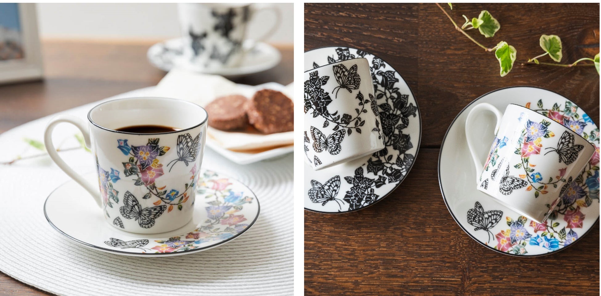 琉球王朝で花開いた染物「紅型」の意匠を、歴史と伝統を備えた「美濃焼」のカップ&ソーサーにあしらいました。