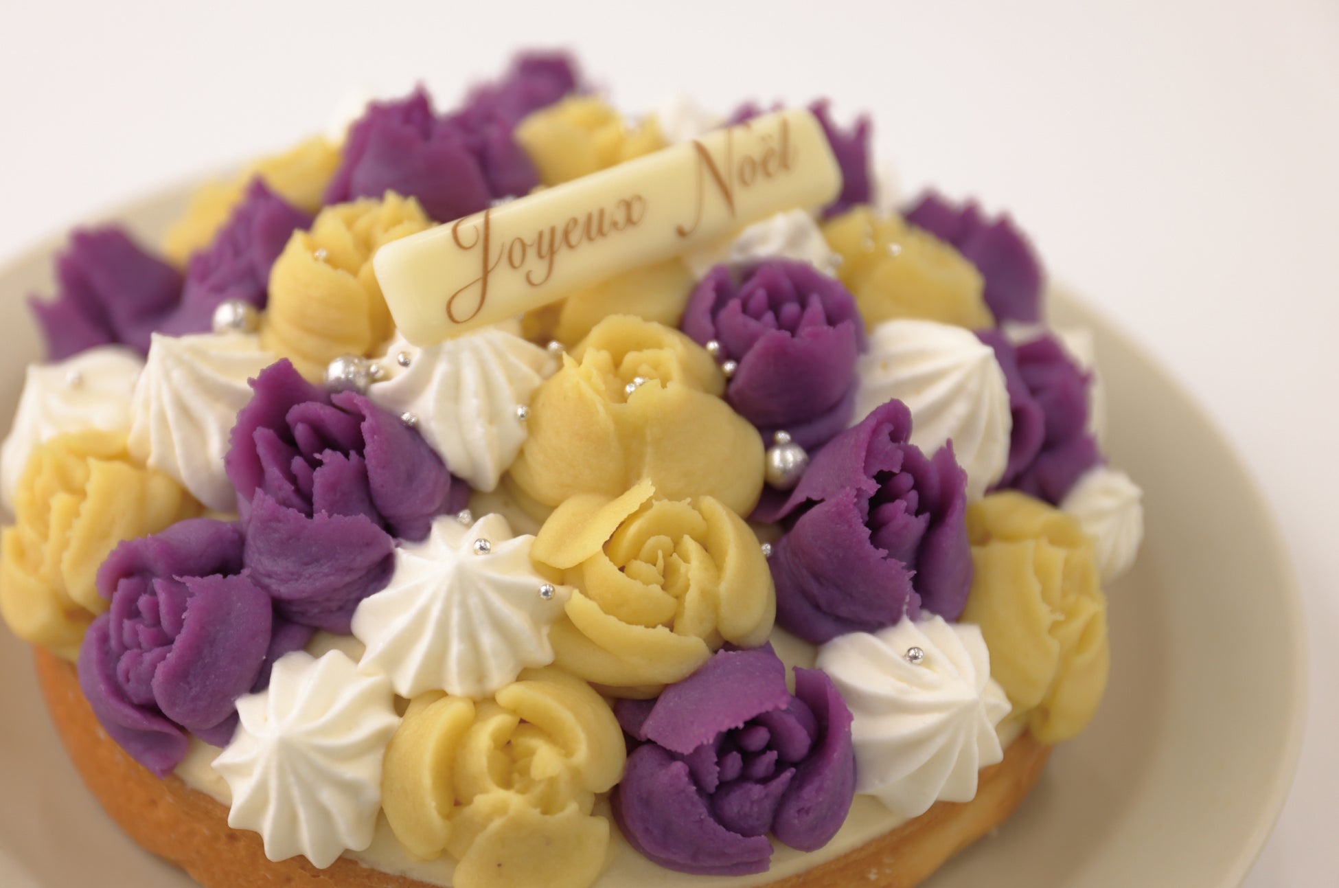 2025クリスマスモンブランは花束のようなデコレーション。金次郎オリジナルのクリスマスモンブランで、芋づくしなクリスマスをお楽しみください。