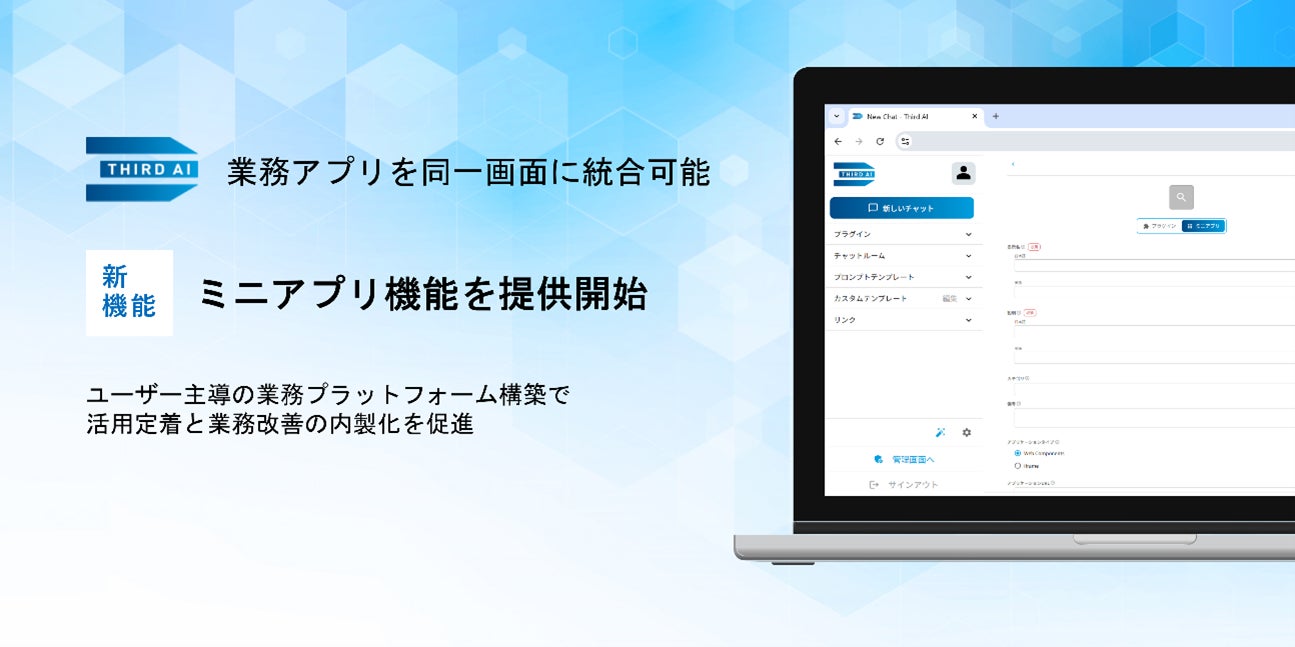 「Third AI 生成AIソリューション」、業務Webアプリを同一画面に統合・組み込めるミニアプリ機能を追加 ~ユーザー主導の業務プラットフォーム構築で活用定着と業務改善の内製化を促進~