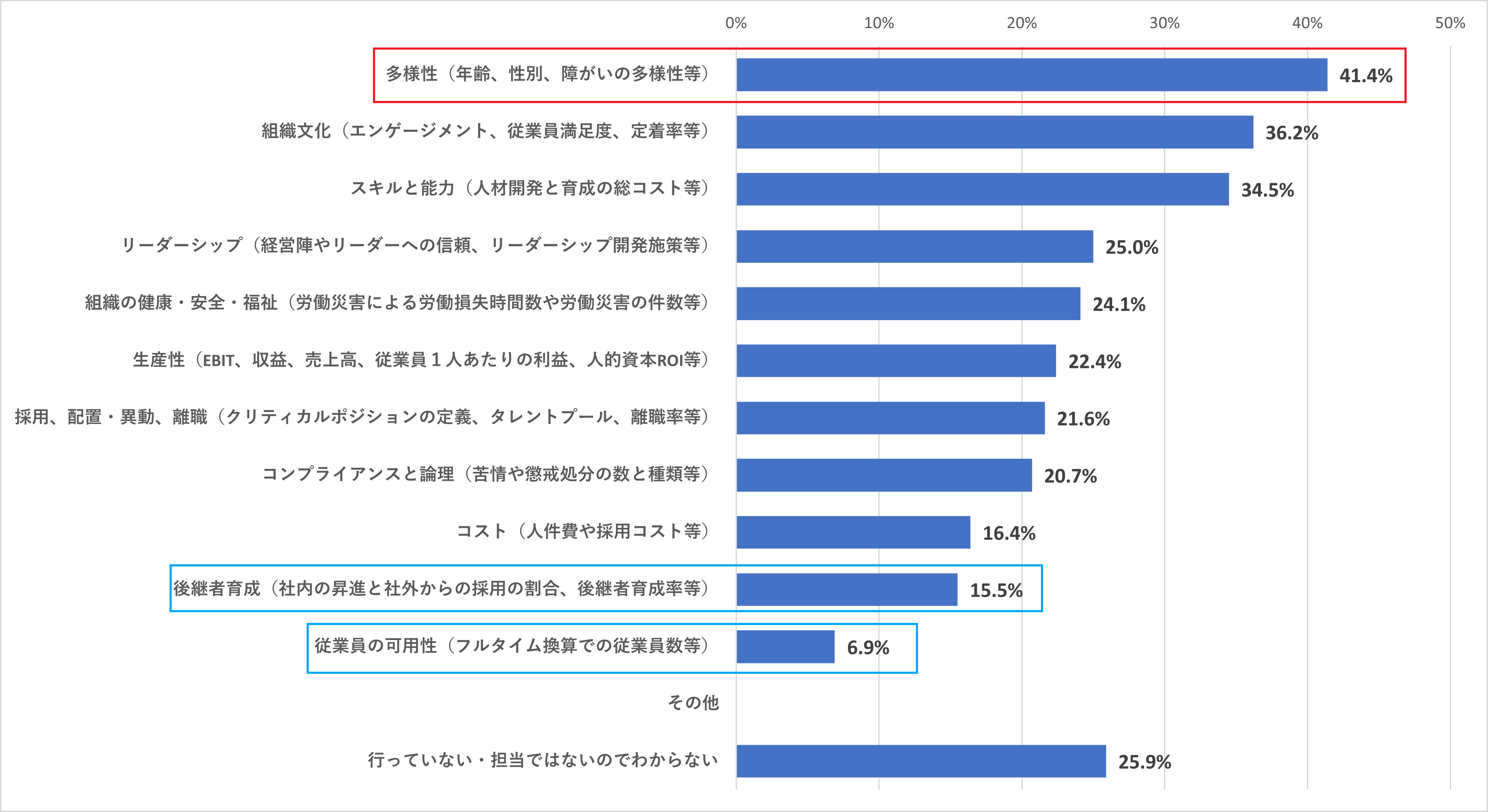 「人的資本経営」の実践が推奨されていることに加えて、開示要請も強まると言われています。企業が開示を検討している項目は「多様性」が最も多く、他項目に比べて企業においても対応が進んでいることが伺えます。一方で、「従業員の可用性」「後継者育成」について開示を検討している企業は少なく、特に「後継者育成」については、重要課題と言われながらもまだ整備化されていないことがわかりました。
