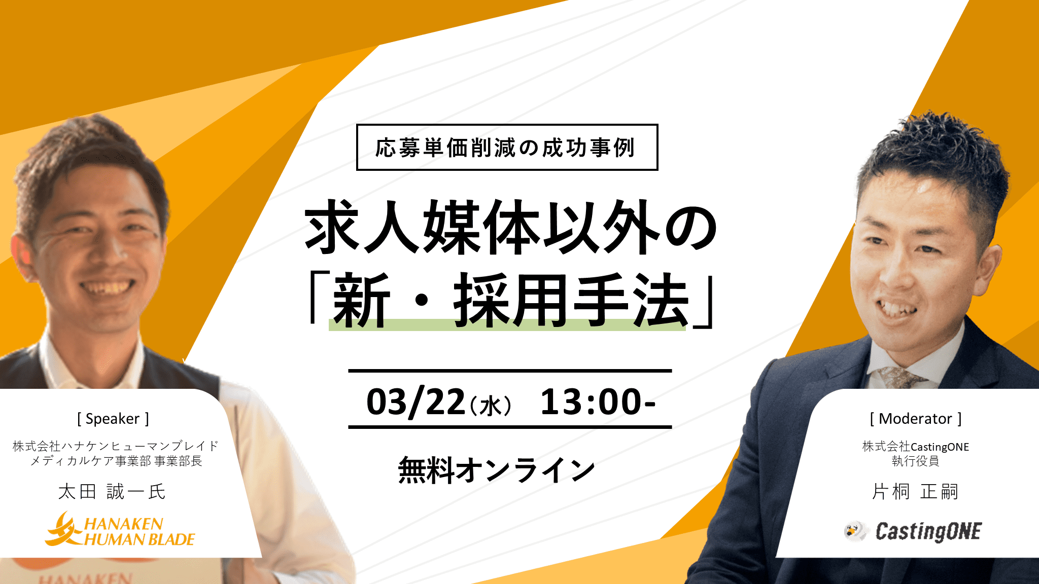 株式会社CastingONE(キャスティングワン、本社:東京都千代田区、代表取締役:野澤 怜司)は、株式会社ハナケンヒューマンブレイドの太田氏をゲストに迎えて、「応募単価を下げる求人媒体以外の【新・採用手法】」について解説する事例セミナーを開催いたします。
