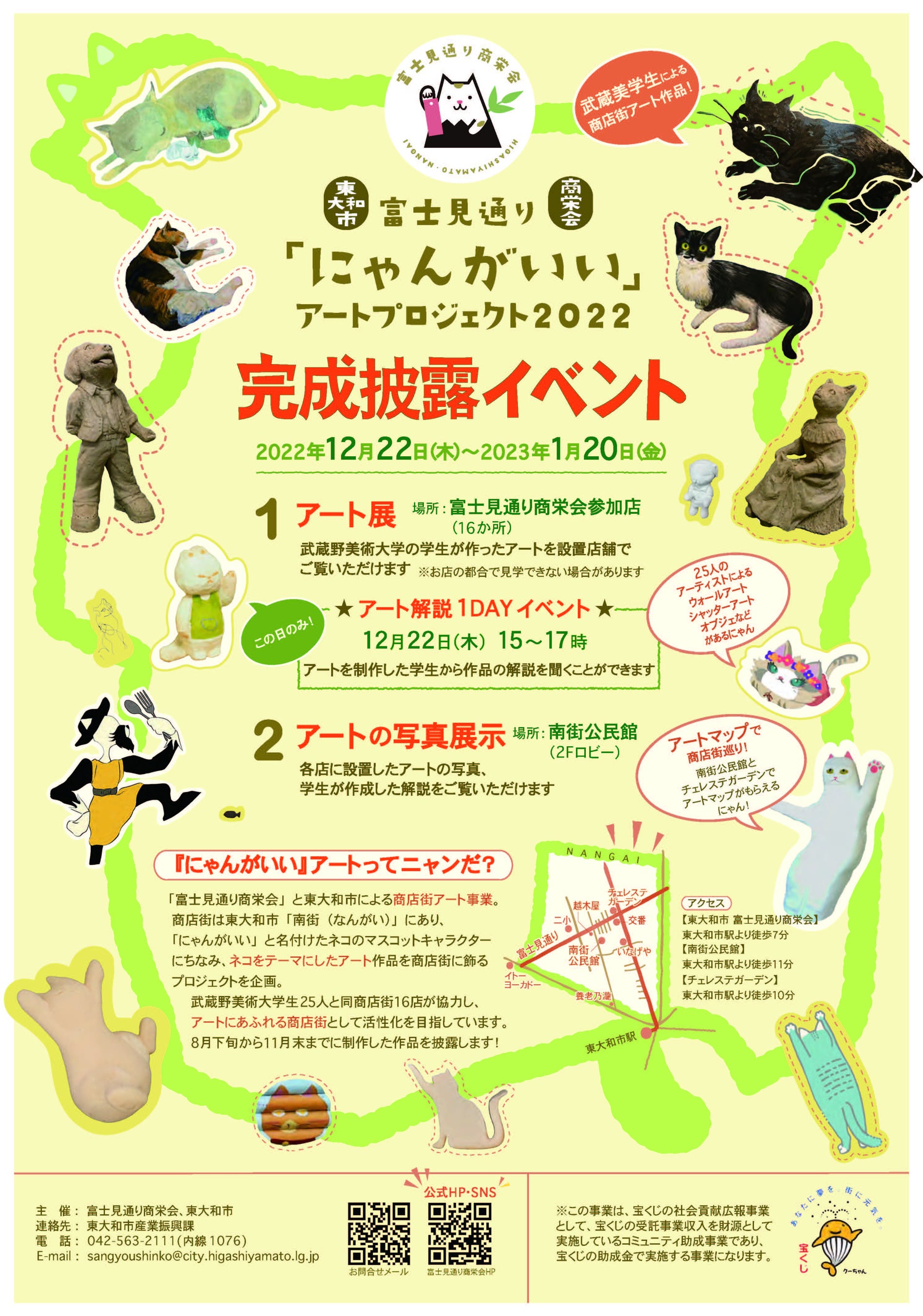 武蔵野美術大学(所在地:東京都小平市/学長:長澤忠徳)と東大和市(市長:尾崎保夫)は、有志学生によるネコをテーマに制作した作品の完成披露イベントを2022年12月22日(木)から2023年1月20日(金)にかけて、東大和市富士見通り商栄会(東京都東大和市南街)や近隣施設で開催します。ぜひお気に入りの一匹を見つけてください。