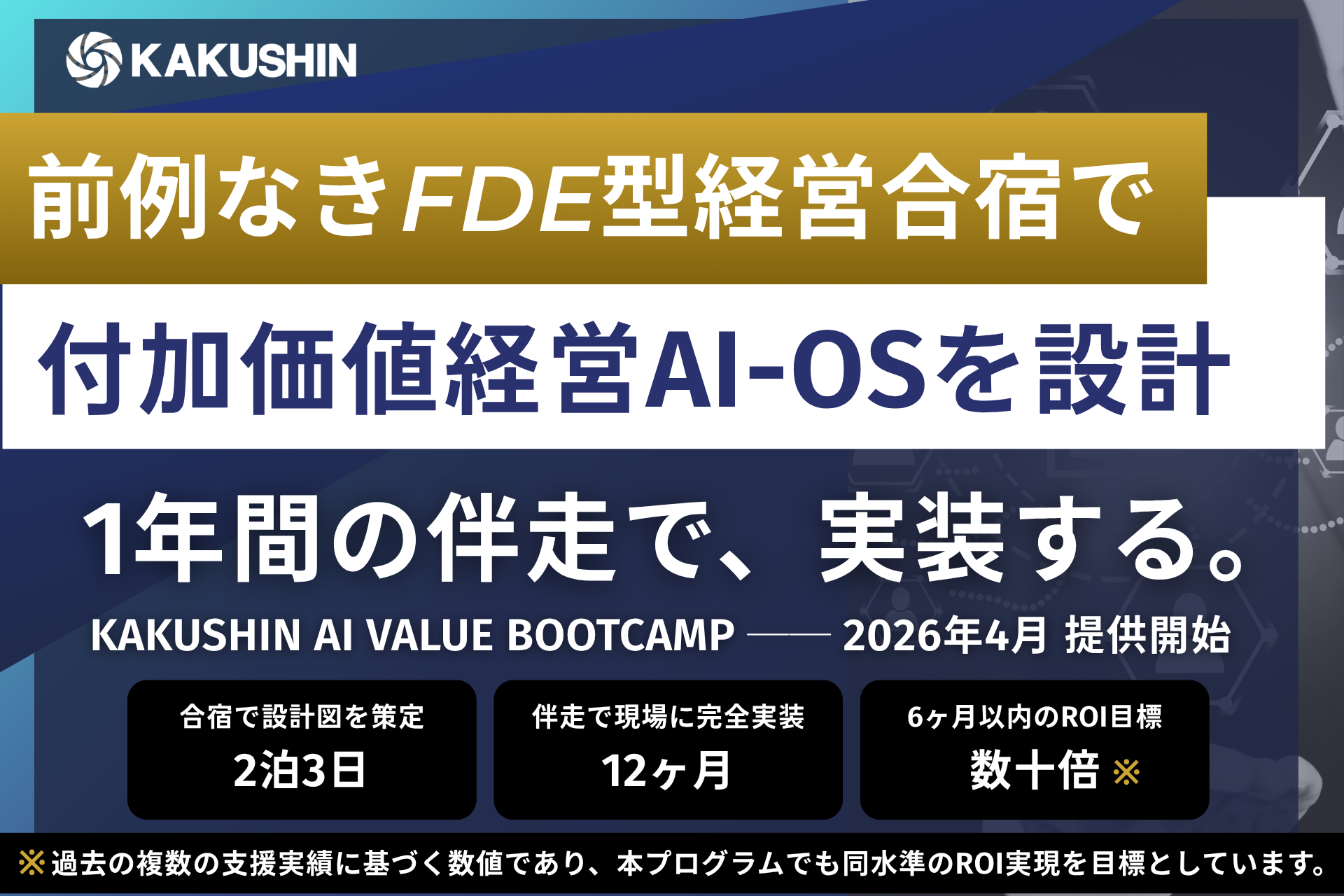 株式会社カクシン(東京本部:東京都港区、代表取締役CEO:田尻 望)は、エンタープライズ企業の経営層を対象とした経営変革プログラム「KAKUSHIN AI VALUE BOOTCAMP」を2026年4月より提供開始します。