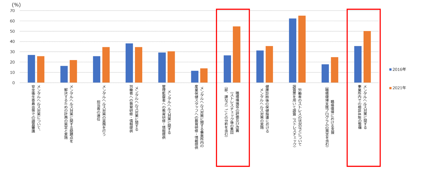 特に、「職場環境等の評価及び改善(ストレスチェック後の集団(部、課など)ごとの分析を含む)」および「メンタルヘルス対策に関する事業所内での相談体制の整備」の2項目において大きく向上しています。