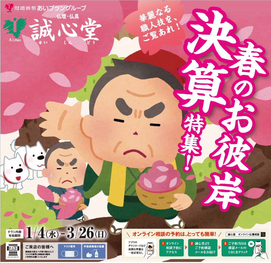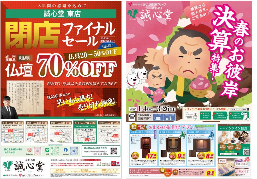 株式会社あいプラン(北海道札幌市/代表取締役・新道喜信)の仏壇・仏具を取り扱う誠心堂で、1月4日~3月26日の期間中、誠心堂全店で春のお彼岸決算特集を開催します。また閉店する東店では8年間の感謝を込めてファイナルセールも開催します。