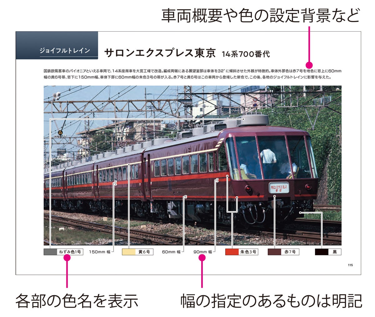 ジョイフルトレイン/機関車/気動車/電車/特急/電車寝台特急/新幹線/客車/郵便車/貨車/事業用車/試作車/御召し列車/車体表記/社内/運転台/ヘッドマーク