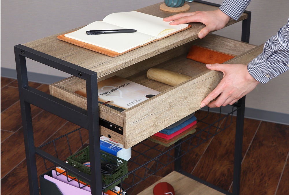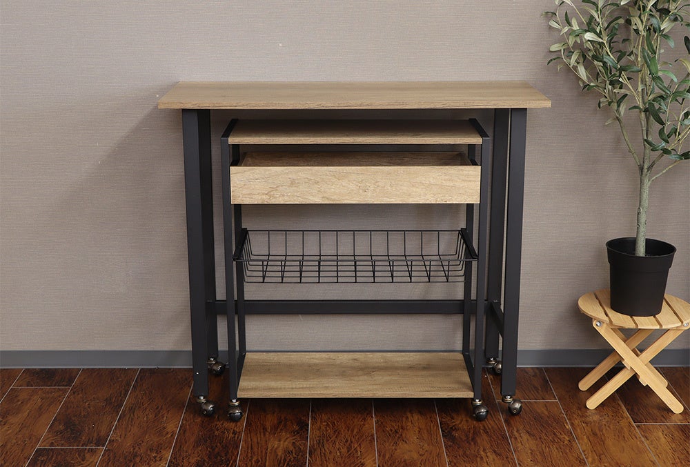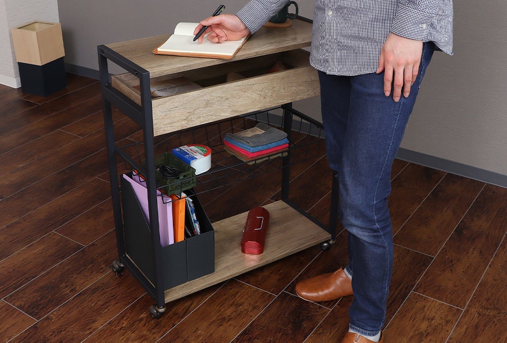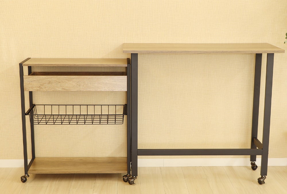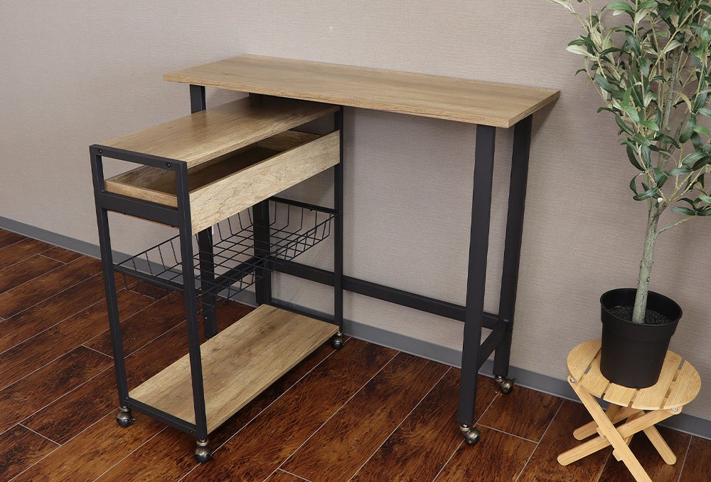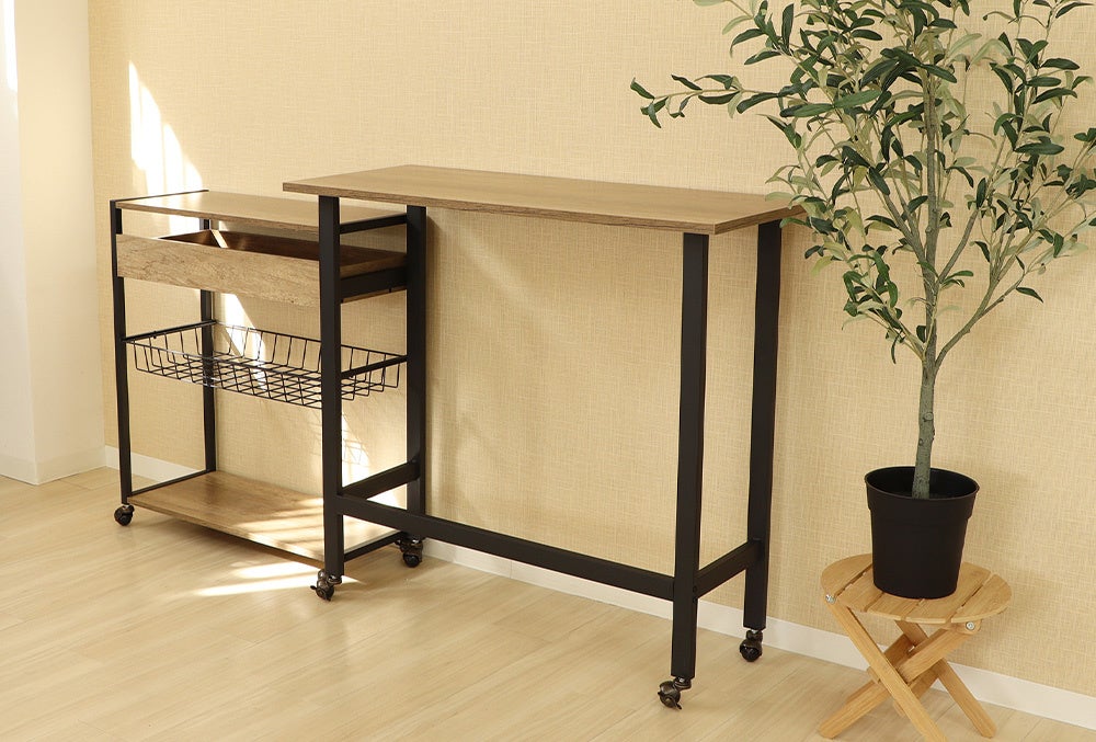 同シリーズのマルチワゴンはカウンターデスクの中にすっぽり収納でき、ONとOFFの使い分けが可能に。キャスターが付いているので、動かしたいときにスッと動かせ、配置替えが簡単です。LDKの間仕切り用としてキッチンカウンターに、また、昼は在宅ワーク用デスクとして、夜はバーカウンターとしてなど、ライフスタイルに合わせ自由な発想で楽しみながら使え、さらにオシャレでカッコいいもかなえる男前家具です。