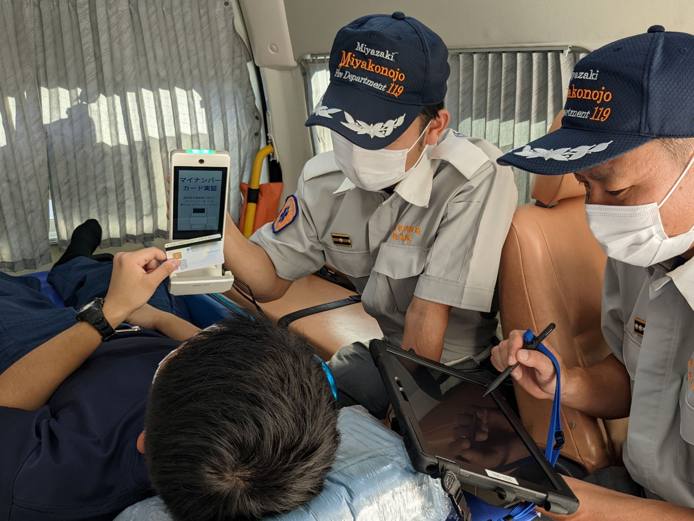 この実証は、救急現場で傷病者が保有するマイナンバーカードを活用して、救急救命士が救急業務に資する医療機関名、既往歴、薬剤等の情報を正確かつ早期に把握することで、傷病者および家族の負担を軽減するとともに、医療機関と連携してより迅速・円滑な救急活動が実現するかを検証するものです。