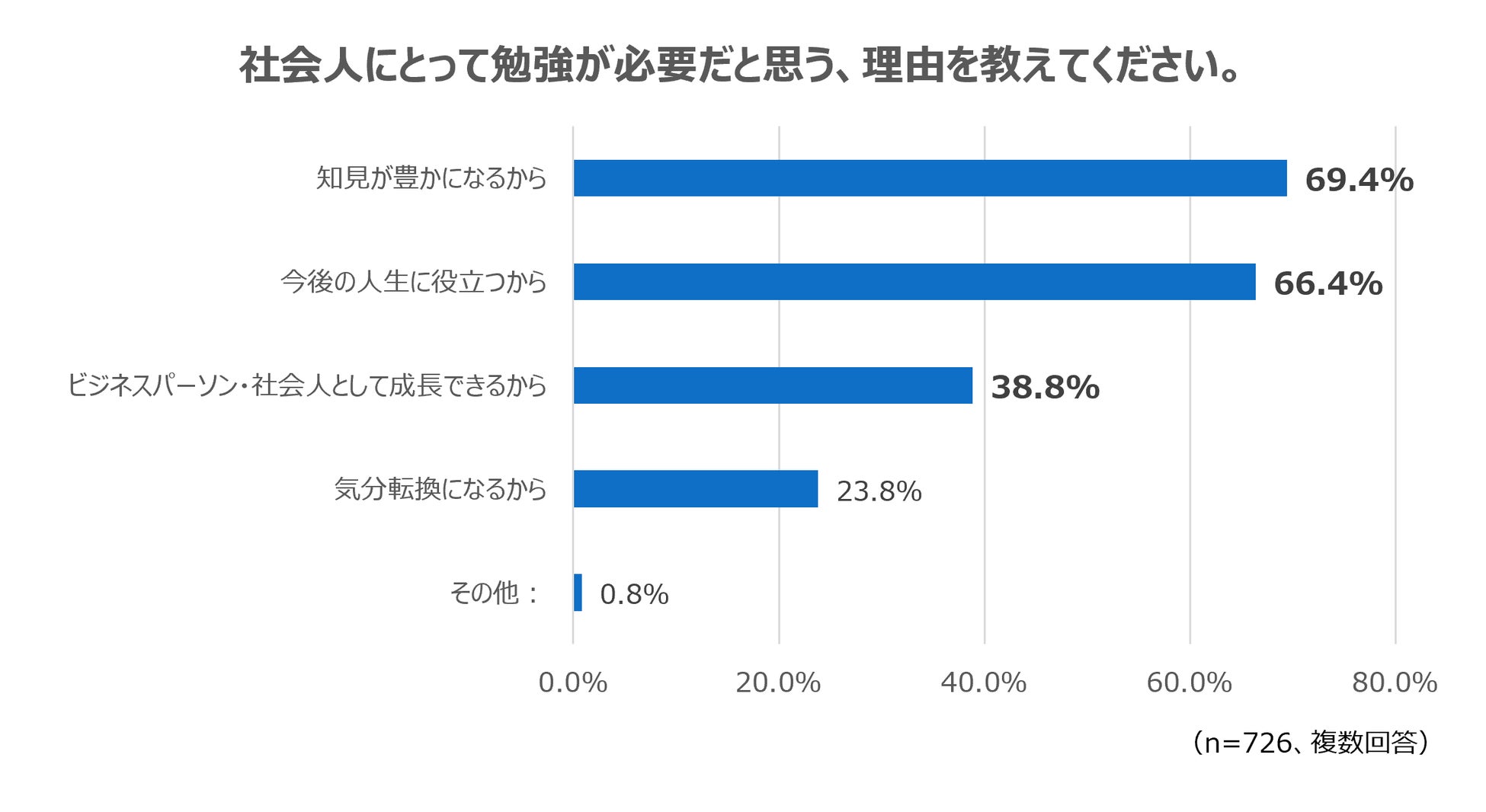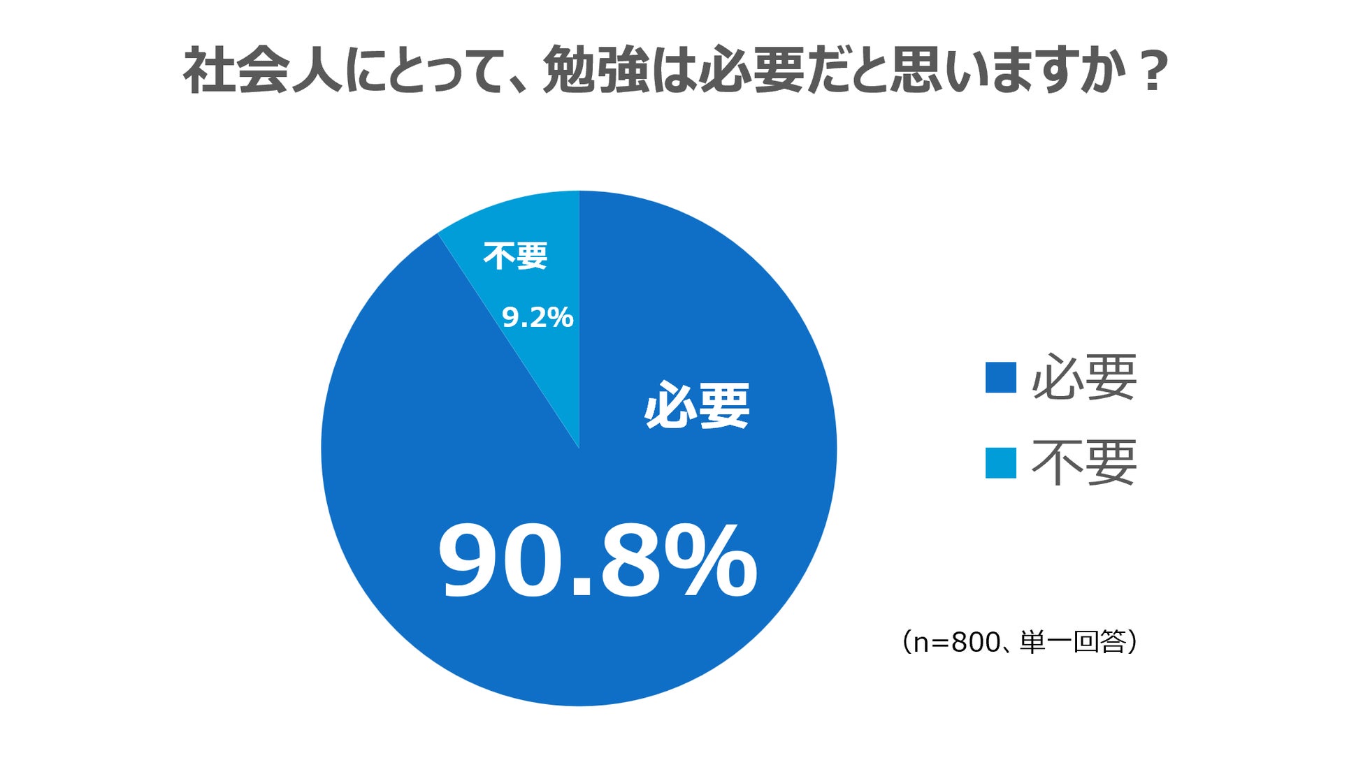 社会人にとって勉強が「必要だ」と考える人は9割を占める結果に。その理由として「知見が豊かになるから」「今後の人生に役立つから」がいずれも6割強の回答でした。
