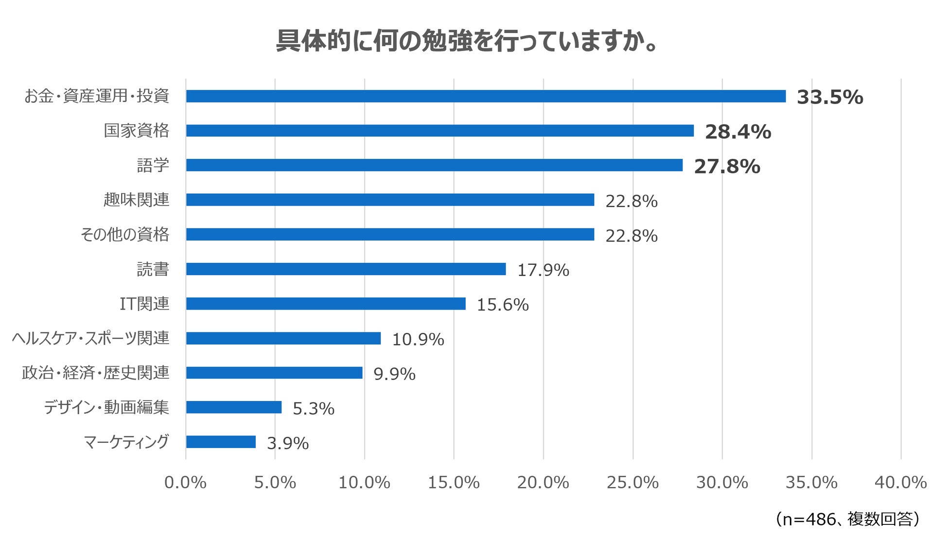 勉強していると回答した人に具体的な勉強内容を聞いたところ、最多が「お金・資産運用・投資」、続けて「国家資格」、「語学」、「その他の資格」「趣味関連」の順となりました。