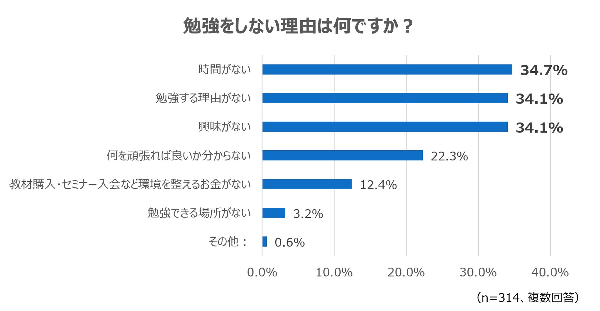 一方で「勉強をしていない」と回答した社会人にその理由を聞いたところ、最多は「勉強する理由がない」、「興味がない」と続きました。