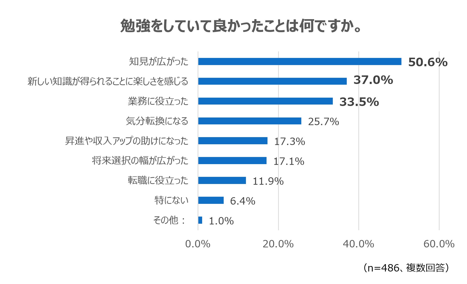 社会人で勉強をしている人に、勉強をしていて良かったことを聞いたところ、「知見が広がった」が過半数を超えて最多、「新しい知識が得られることに楽しさを感じる」「業務に役立った」の回答も多い結果でした。