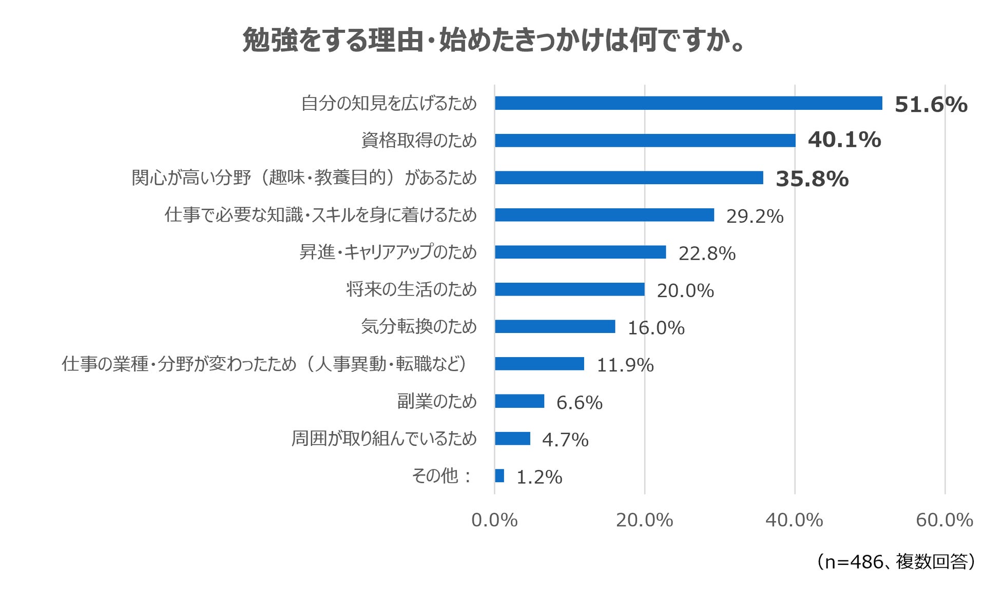 社会人になってから勉強をしている人に、勉強をする理由・始めたきっかけを聞いたところ、「自分の知見を広げるため」が過半数を超えて最多、続けて多い選択肢も「資格取得のため」、「関心が高い分野(趣味・教養目的)があるため」と、自分の人生を豊かにする理由・きっかけが多い結果となりました。「仕事で必要な知識・スキルを身に着けるため」「昇進・キャリアアップのため」などの仕事関連の理由は、いずれも3割未満でした。
