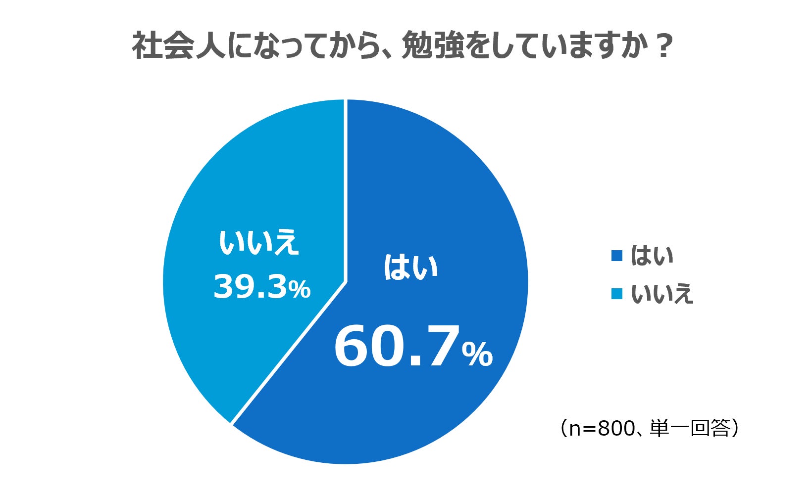 「社会人になって勉強しているか」という質問に対して、「はい」と答えた人は約6割。9割以上の人が社会人に勉強は必要と考えるにもかかわらず、実際に勉強ができているのは約6割であることが判明しました。