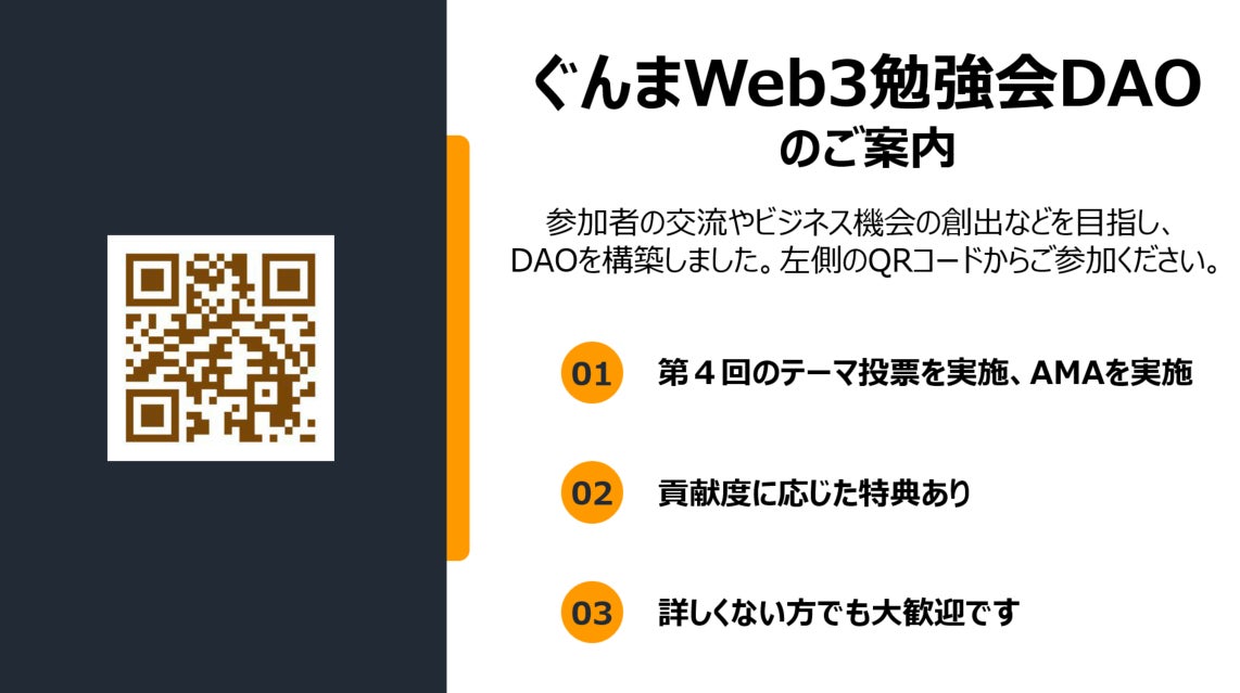 群馬県が主催するWeb3先進事例勉強会では、参加者の交流やビジネス機会の創出などを目指し、また、実践や体験の場として、参加者等の皆様を対象に、「ぐんまWeb3勉強会DAO」を構築されました。コミュニティメンバーはガバナンストークンを通じて投票権を得ることができ、Web3勉強会の内容や方針を形成する上で重要な役割を果たします。