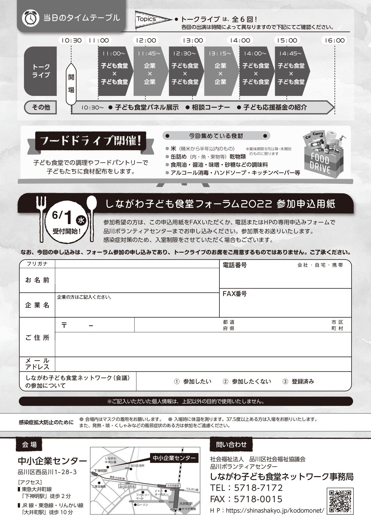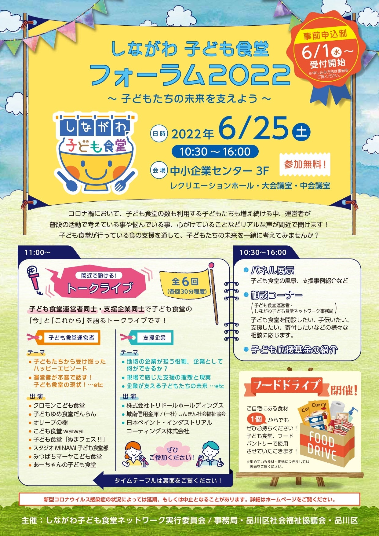6年目を迎える今年は「子どもたちの未来を支えよう」をテーマに、子ども食堂運営者、支援企業によるトークライブ、パネル展示、子ども食堂に関わりたい人への相談コーナー、子ども食堂の様子が分かる動画上映、各家庭で使い切れない未使用食品を持ち寄り寄贈するフードドライブを実施します。