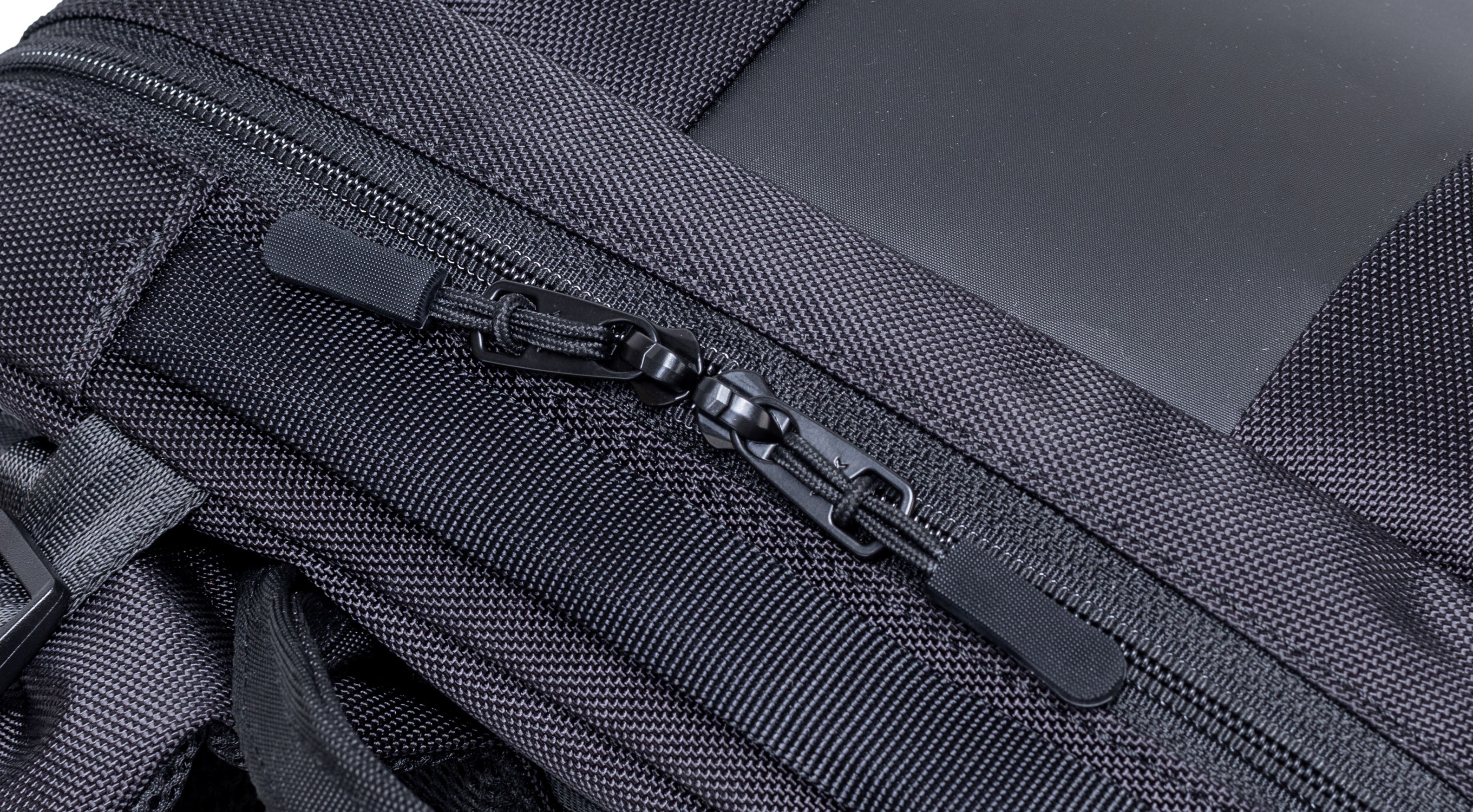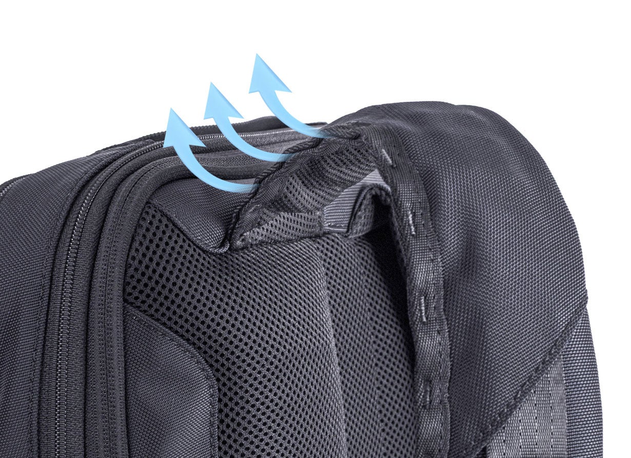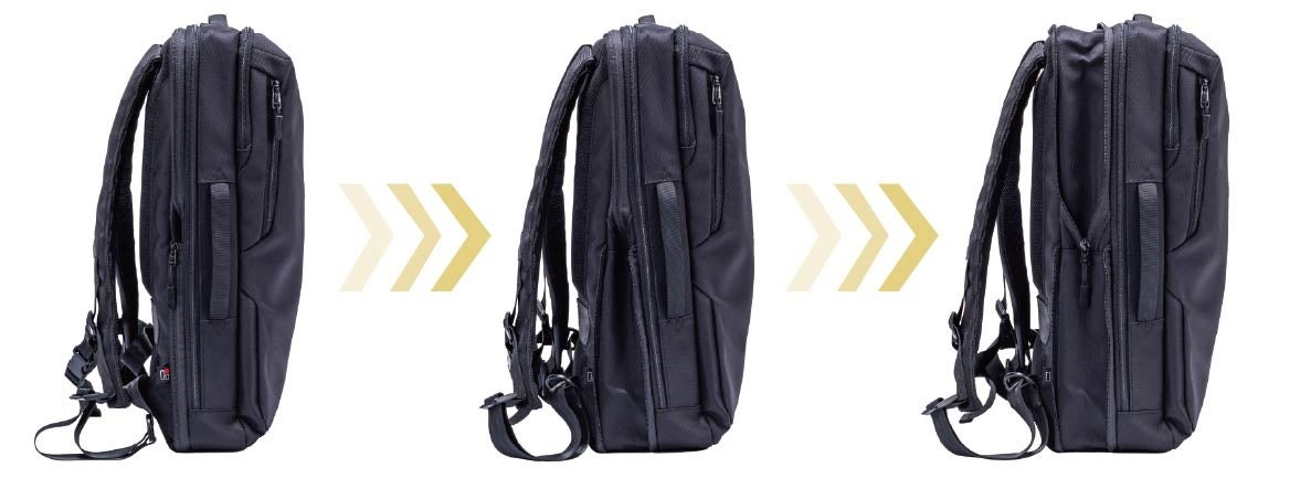 ビジネスモデルは、荷物の量に合わせて2段階にサイズアップする拡張ファスナー付きです。