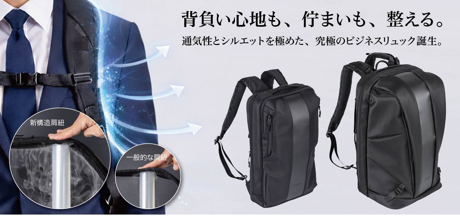 ビジネスリュックにおいてこれまで見過ごされてきたショルダーストラップの「蒸れ」に着目。