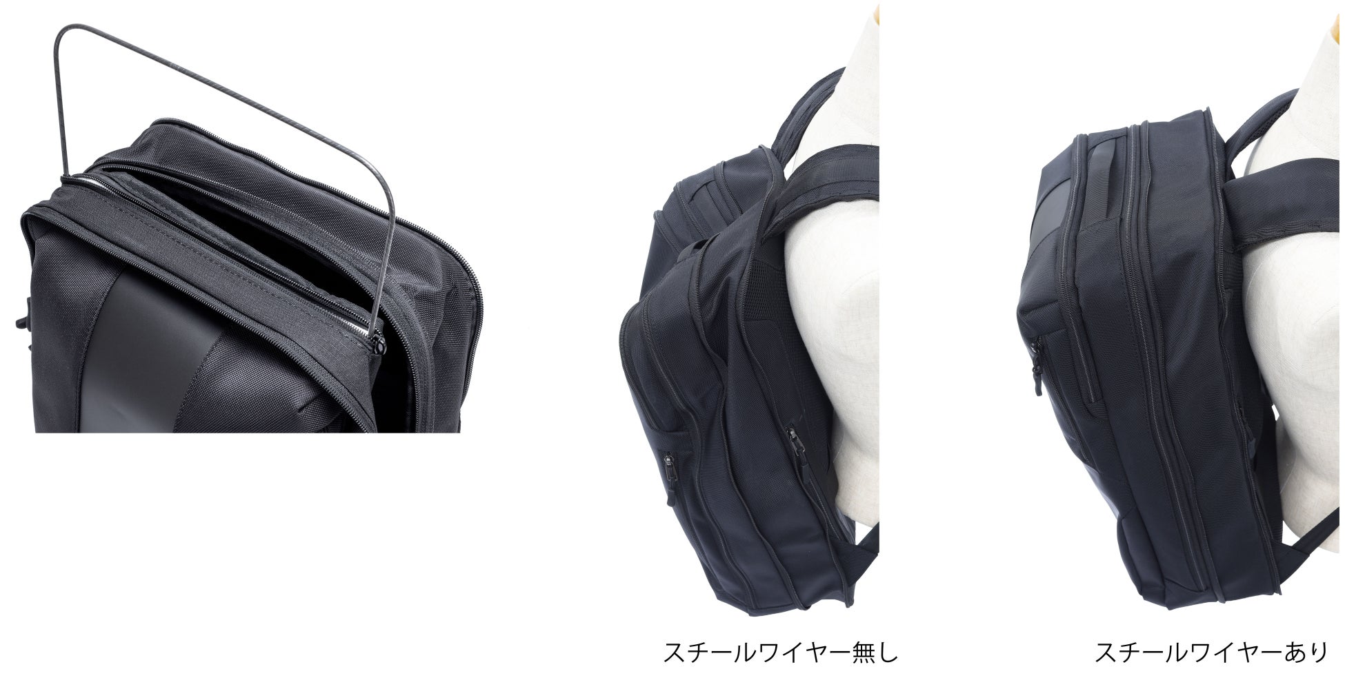 内部にスチールワイヤーを搭載し、型崩れを防止。荷物の量に関わらず、フォルムをしっかりとキープする構造で、どんなビジネスシーンでも型崩れしにくく、スマートなたたずまいをキープします。