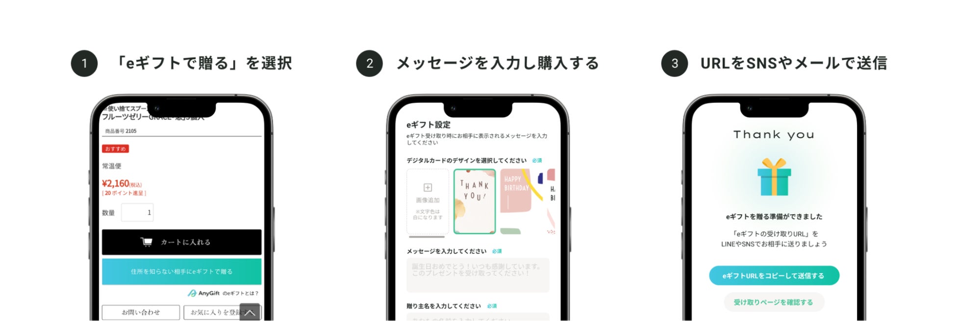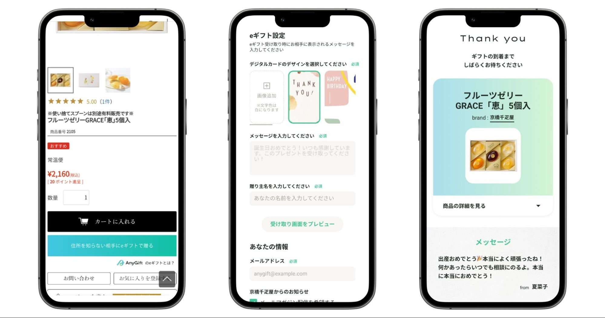 AnyGiftは、相手の住所を知らなくてもLINEやメールで贈ることができる"eギフト機能"を、ECサイトに組み込むことができるサービスです。