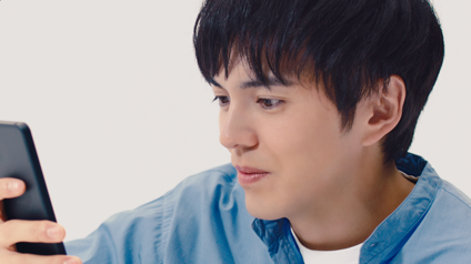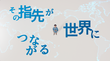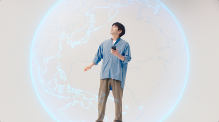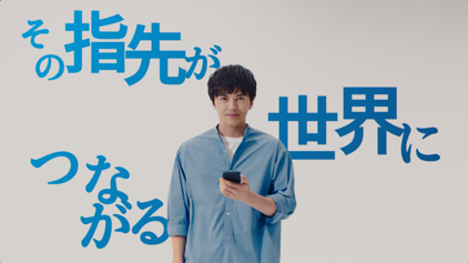 CMで地球儀がスマホ操作とリンクして回るシーンはCGなので、自分の頭の中でイメージを膨らませて撮影に臨みました。シンプルだけど格好よくてクールなCM、「世界とつながるということ」をテーマにとっても希望溢れる前向きなテイストのCMになっています。