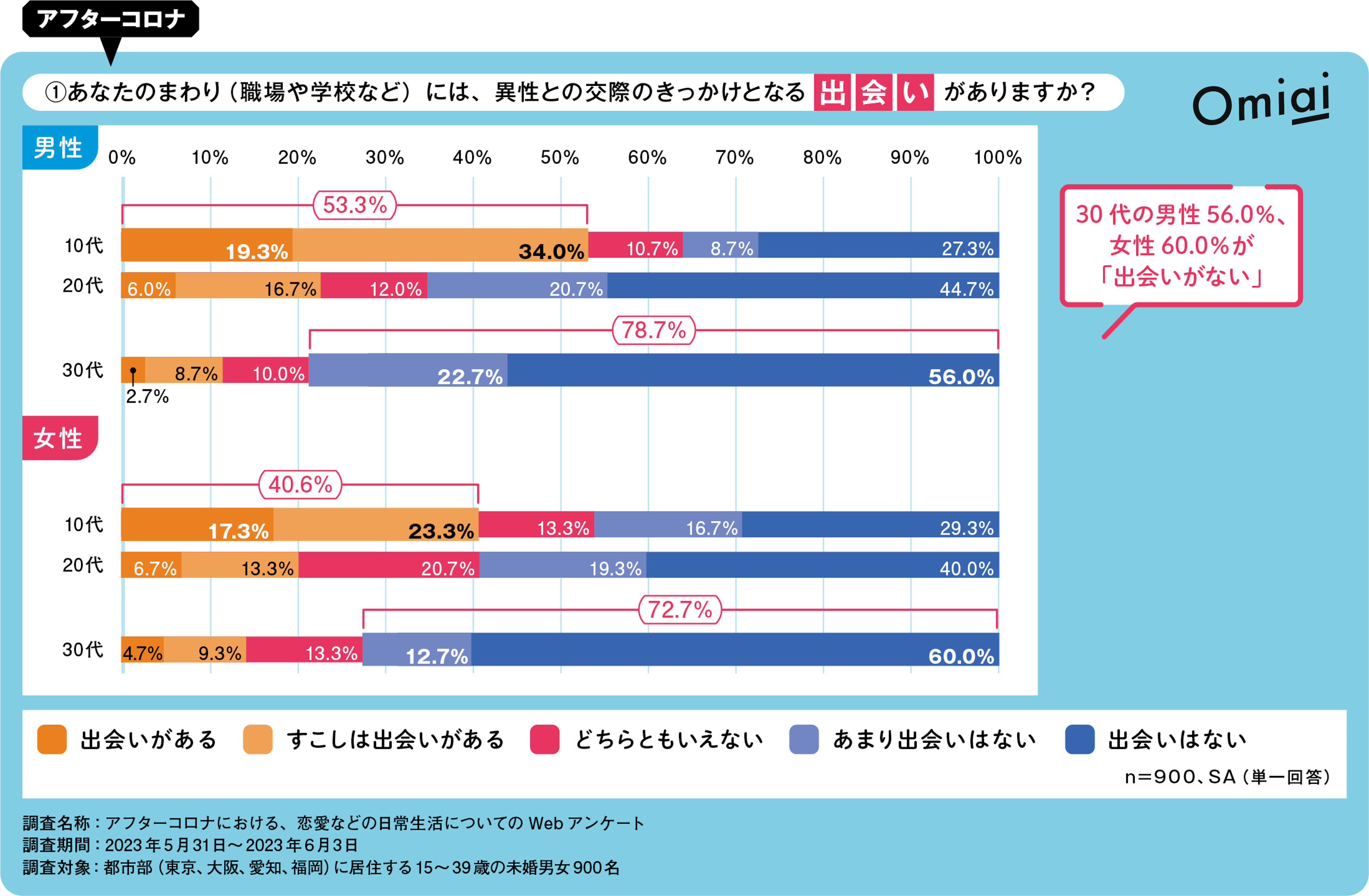 新型コロナウイルス感染症が5類引き下げとなり、ノーマスクが解禁され、時代はコロナ禍からアフターコロナへ。そこで Omiai Reportでは、未婚男女900名を対象に、「アフターコロナにおける恋愛意識調査」を実施。今号では「出会い」について、アフターコロナにおける恋愛行動を分析します。