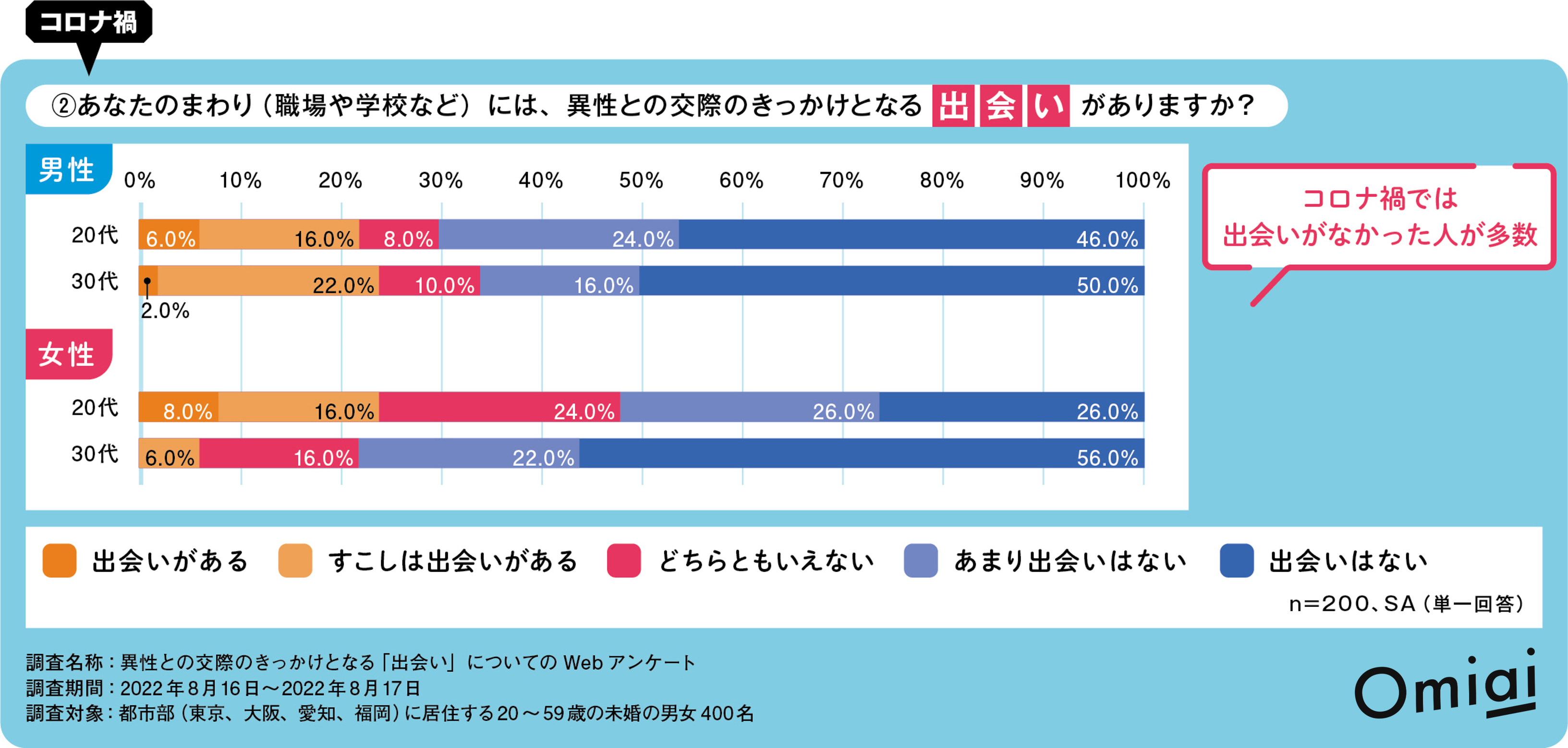 アフターコロナになり「職場や学校などで、異性との交際のきっかけとなる出会いはあるかどうか」(グラフ①)をアンケート調査したところ、30代男性の78.7%、30代女性の72.7%が「出会いはない/あまり出会いはない」と回答。昨年 8月のコロナ禍で行った調査(グラフ②)と比較しても、20代男女を含めコロナ禍で減った出会いは、まだ改善には至っていないことがわかりました。