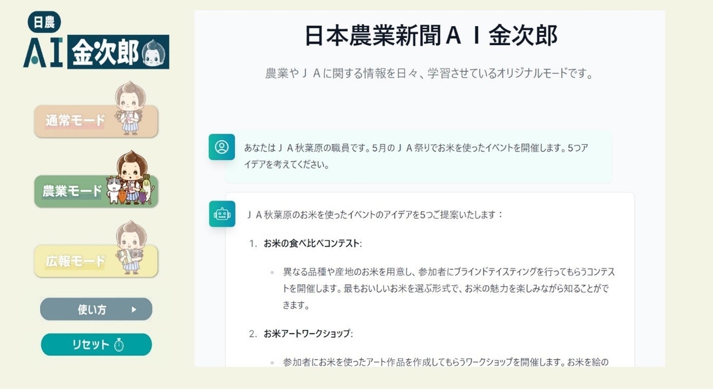 「日農AI金次郎」は、JAの文書作成や企画・イベントの立案を支援する生成人工知能(AI)・チャットGPTです。一から考えると手間や時間のかかる、企画書や報告書、メール、議事録、あいさつ文、プレスリリースといった文書の作成や校正が簡単にでき、業務を効率化できます。「JA祭で行うイベントの案を5つ考えて」など、アイデア出しにも使えます。