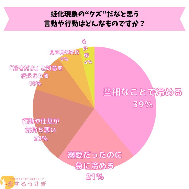 恋するうさぎ編集部が行った『蛙化現象の“クズ”だなと思う言動や行動』のアンケートによると1位:些細なことで冷めるが39%、2位:溺愛だったのに急に冷めるが21%、3位:行動や仕草が気持ち悪いが20%という結果になりました。
