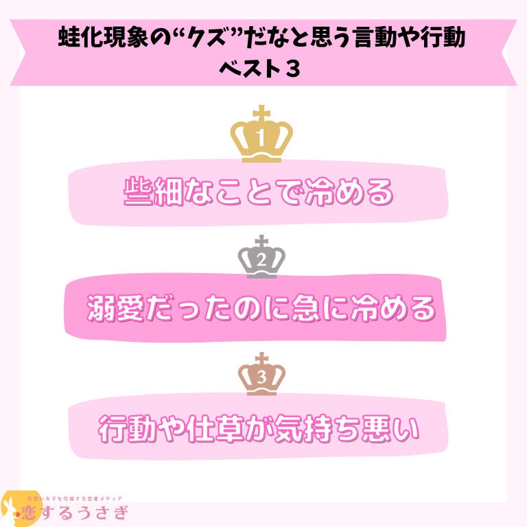 最近よく耳にする“蛙化現象”という言葉ですが、実際に蛙化現象を経験して「クズだな」と思った言動や行動で1番多かったのは『些細なことで冷める』ということでした。