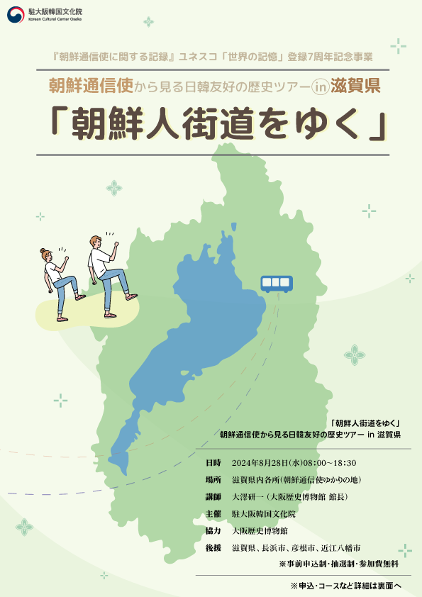 大阪韓国文化院(院長 金蕙穗、以下 文化院)は、8月28日(水)に、『朝鮮通信使に関する記録』ユネスコ「世界の記憶」登録7周年を記念し、琵琶湖で有名な滋賀県にて「朝鮮通信使から見る日韓友好の歴史ツアーin滋賀県、朝鮮人街道をゆく」を開催しました。