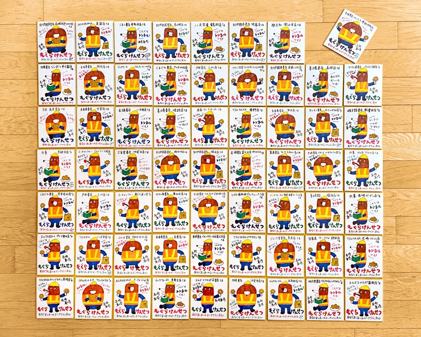『もぐらけんせつ あなぐましまいのドーナツトンネル』の発売に際して、作者の長崎真悟さんが描いた直筆ミニ色紙が、応援書店さんの店頭を飾ります。