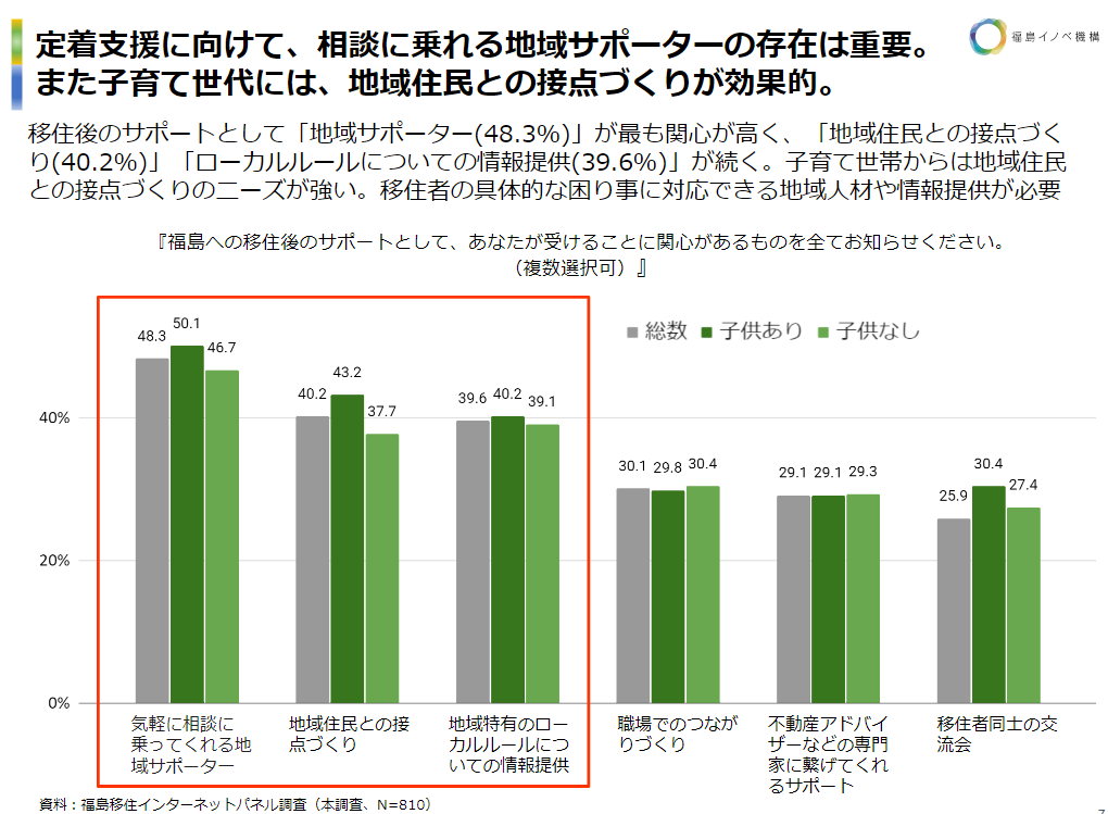 定着支援に向けた地域サポーターの役割は重要であり、移住者の具体的な困り事に対応できる地域人材や情報提供が重要です。