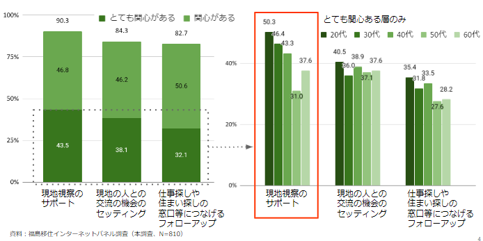 さらに「とても関心がある」と答えた人のうち、「現地視察のサポート」は、20代が50.3%と関心が高いことが分かりました。特に若い層は、移住検討の際にみるべきポイントがつかみ切れていないことが想定されます。移住検討にあたって現地視察は重要であることから、その進め方の可視化・提示が必要です。
