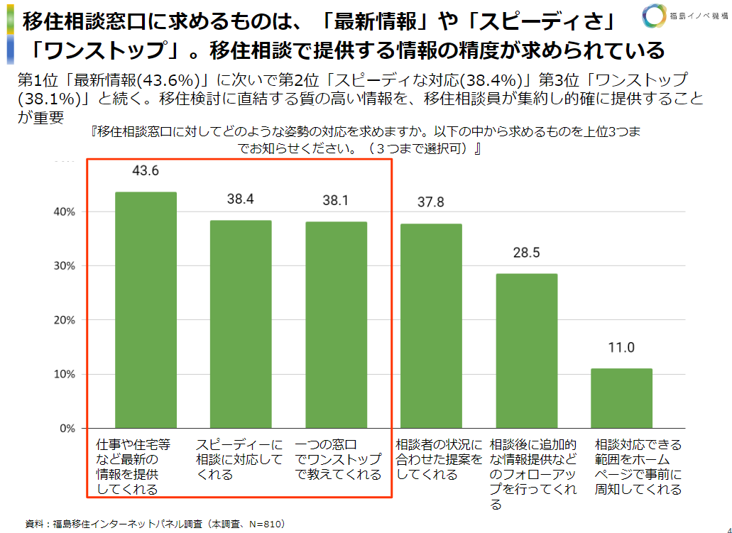 移住希望者が相談窓口に求めるものは、「住宅・仕事などの最新情報(43.6%)」が最も多く、次いで「スピーディな対応(38.4%)」、「ワンストップ(38.1%)」となりました。