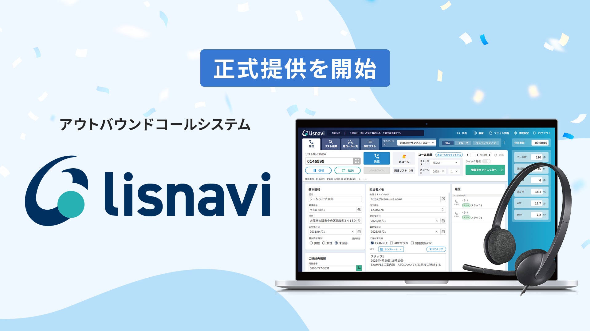 株式会社Scene Live(本社:大阪府大阪市、代表取締役:磯村 亮典 以下、Scene Live)は、2025年4月1日より、アウトバウンドコールシステム『lisnavi(リスナビ)』の正式提供を開始いたしました。