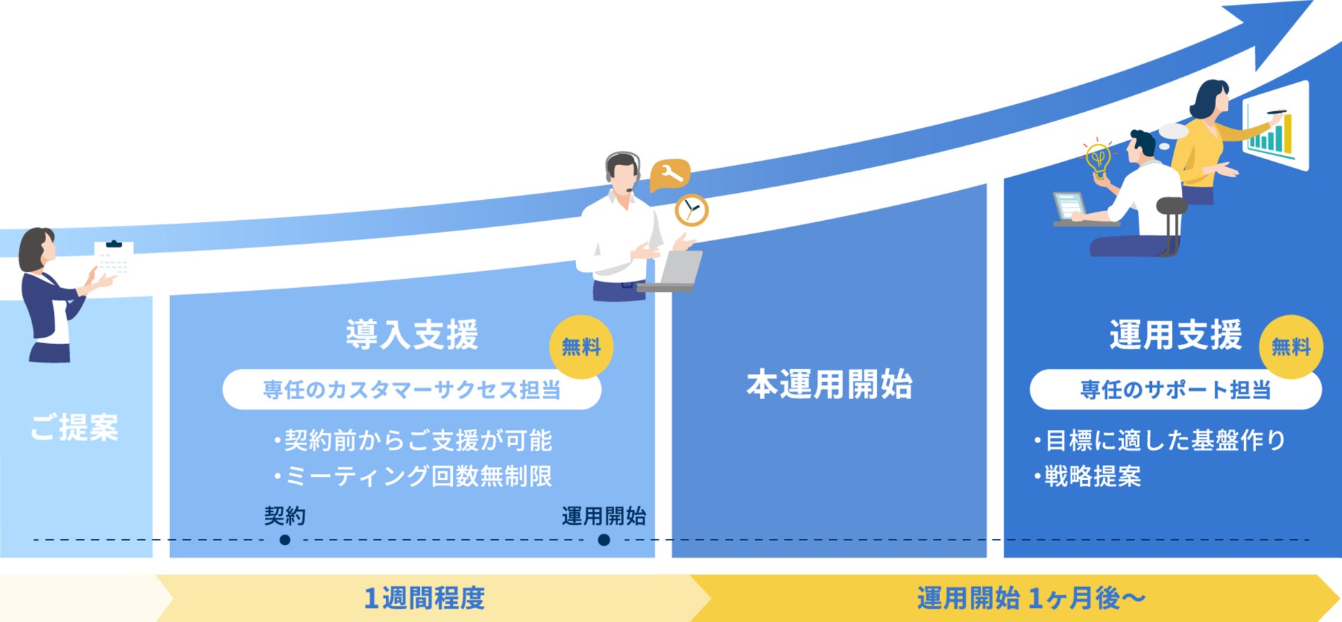 ご利用開始前から、実際に定着するまでの期間を徹底的にサポートします。お客さまの課題に応じた提案と支援を一貫しておこない、導入効果を最大化します。