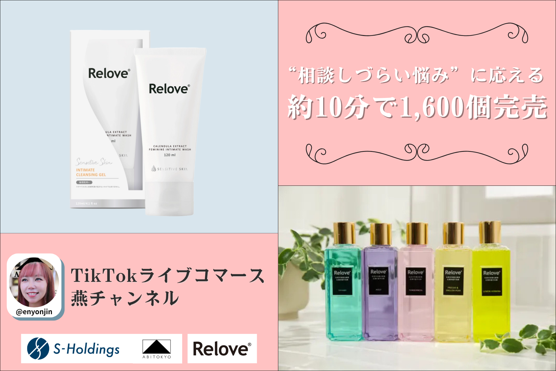 ライブコマース事業、ブランド事業、AI事業などを展開し、日常と未来を彩る最高の体験を創造する株式会社Sホールディングス(本社:東京都品川区、代表取締役CEO: 燕 咏靖)は、当社運営のアパレルブランドABITOKYOが企画・配信するTikTokライブコマース「燕チャンネル」において、2026年3月17日(火)、日本初上陸となる台湾発のフェムケアブランド「Relove(リラブ)」のライブ配信を実施しました。本配信では、約10分で約1,600点を完売し、売上高約400万円を記録。配信開始直後から注文が集中し、短時間で高い販売実績を創出しました。