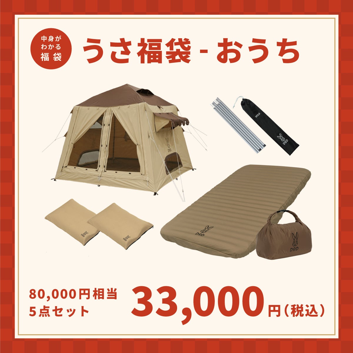 福袋は全部で5種展開。目玉は人気商品の「おうちテント」(定価49,500円)、エアマット「ソトネノキワミエアーM」(定価19,800円)、エア式枕「ソトネノマクラ」(定価4,400円)2点、「テント・タープポール」(定価1,420円)の5点がセットになった「うさ福袋-おうち」。