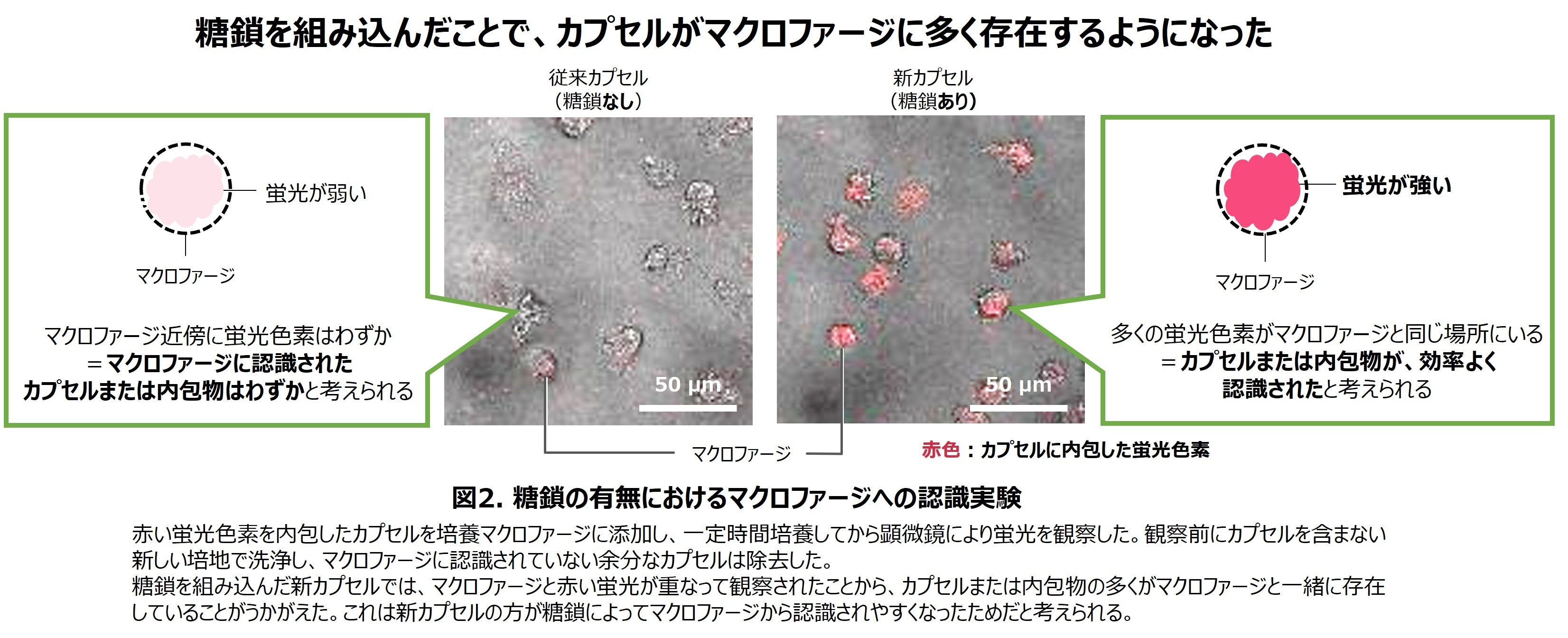 この方法で新カプセルと糖鎖を組み込んでいない従来カプセルを比較した結果(図2)、新カプセルではマクロファージに強い蛍光が観察されました。